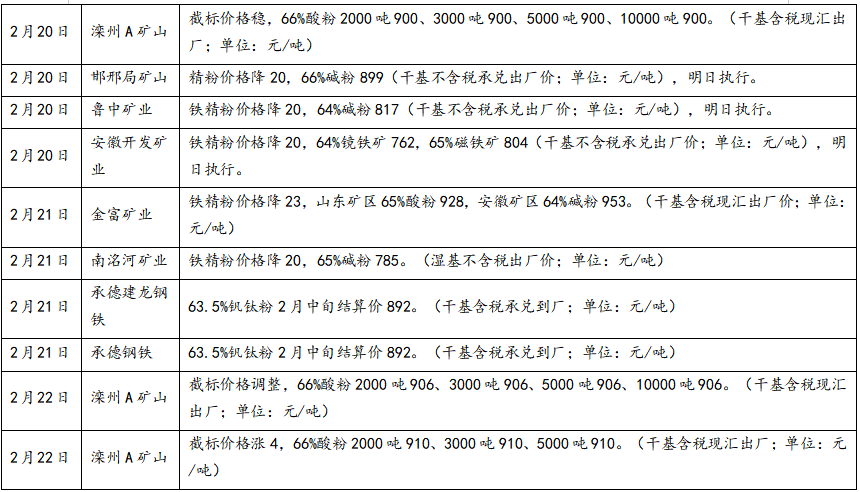 春節(jié)假期期間,多數(shù)鋼企已提前補(bǔ)庫完成,僅個(gè)別鋼企少量采購國內(nèi)礦精粉,受外盤市場(chǎng)下行影響,部分地區(qū)精粉價(jià)格下調(diào),整體市場(chǎng)偏弱運(yùn)行。假期期間部分鋼企、礦山調(diào)價(jià)信息如下: