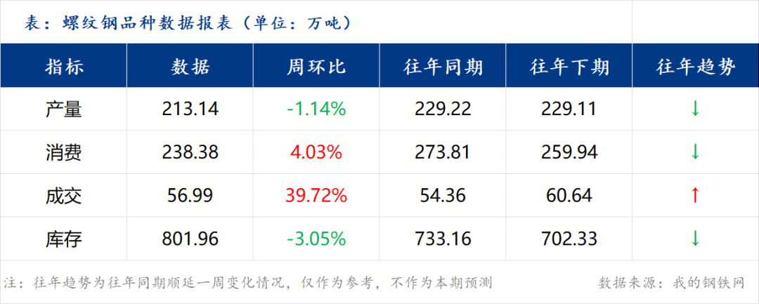 總結(jié):產(chǎn)量:當前產(chǎn)量由增轉(zhuǎn)降,復(fù)產(chǎn)節(jié)奏放緩。本周螺紋鋼產(chǎn)量為213.14萬噸,周環(huán)比下降1.14%(減少2.45萬噸)。據(jù)Mysteel調(diào)研,本周137家螺紋鋼廠的開工率為41.64%,產(chǎn)能利用率為46.72%。減產(chǎn)主因部分鋼廠在盈利水平仍偏低的背景下進行臨時檢修。預(yù)計下周產(chǎn)量或維持低位震蕩,生產(chǎn)節(jié)奏受利潤制約。需求:表需連續(xù)第八周回升,增幅有所擴大。本周螺紋鋼表觀消費量為238.38萬噸,周環(huán)比上漲4.03%(增加9.24萬噸)。需求已進入傳統(tǒng)旺季通道,且本周增幅較前幾周明顯提升,反映季節(jié)性需求正在逐步釋放。但絕對水平與歷史旺季相比仍有差距,房地產(chǎn)新開工疲軟仍是主要制約。預(yù)計下周表需在季節(jié)性支撐下或繼續(xù)溫和增加。成交:市場成交量明顯改善,終端采購積極性上升。本周螺紋鋼成交量為56.99萬噸,周環(huán)比上漲39.72%。期螺趨強運行帶動商家現(xiàn)貨報價主流順勢上調(diào),終端按需采購與部分投機需求均有入場。預(yù)計下周成交在需求釋放與市場情緒回暖的背景下或維持活躍。庫存:總庫存連續(xù)第五周下降,去庫速度加快。本周螺紋鋼總庫存為801.96萬噸,周環(huán)比下降3.05%(減少25.24萬噸)。其中,鋼廠庫存200.62萬噸,環(huán)比減少6.92萬噸,降幅3.33%;社會庫存601.34萬噸,環(huán)比減少18.32萬噸,降幅2.96%。庫存已進入加速去化通道,但絕對水平仍處高位,區(qū)域結(jié)構(gòu)仍不平衡(如杭州庫存147.4萬噸)。預(yù)計下周庫存維持去化,速率或受需求強度影響。綜上所述,本周基本面呈現(xiàn) “供減需增、庫存加速去化” 的積極變化格局。供應(yīng)端在利潤壓制下主動收縮,而需求端在季節(jié)性驅(qū)動下復(fù)蘇力度增強,帶動庫存去化速度明顯加快。市場情緒在期現(xiàn)價格聯(lián)袂上漲(螺紋鋼現(xiàn)貨均價周漲31元/噸)中得以提振。盡管高庫存的絕對壓力依然存在,但在成本支撐有效、產(chǎn)業(yè)壓力相對可控的背景下,前期弱勢下跌釋放了部分風險并強化了市場抗跌情緒。綜合來看,短期市場在供需邊際改善的驅(qū)動下,情緒及價格重心或呈現(xiàn)小幅趨強的運行態(tài)勢。
